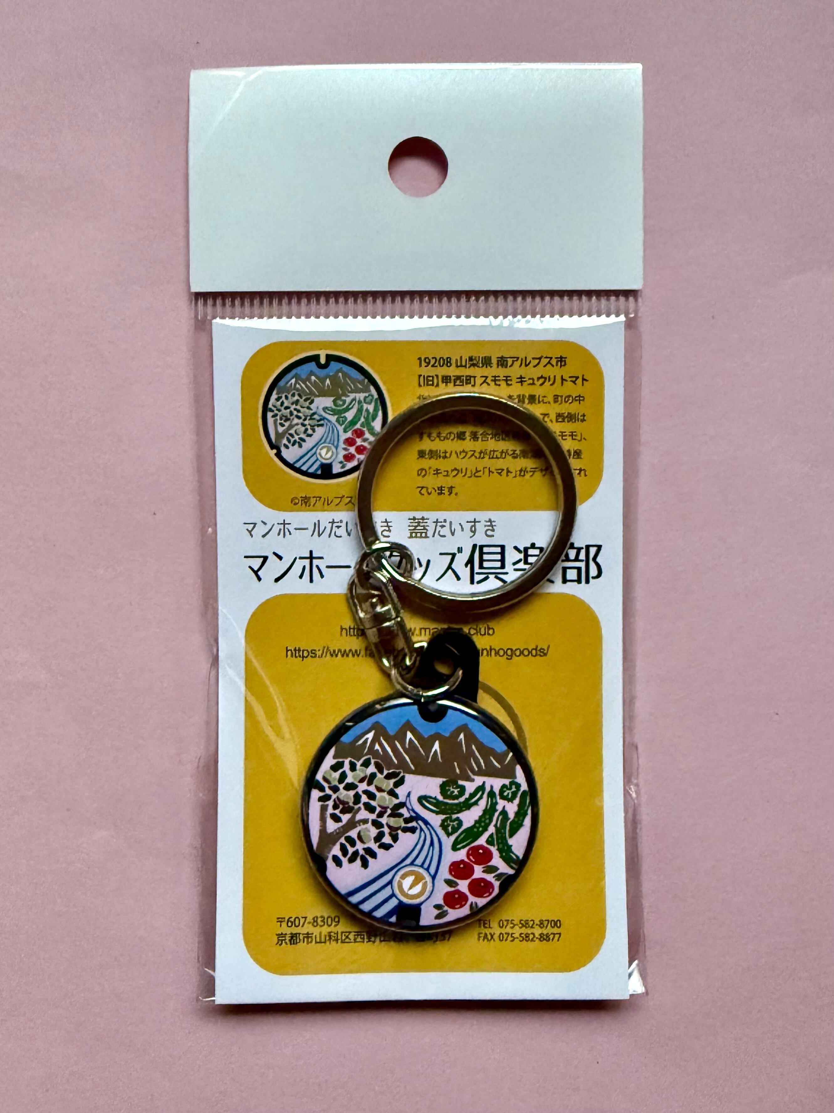 毎年ご購入いただいているカスタマー様、初めてお目にするマンホールグッズ倶楽部のお客様、お待たせしました!ユニークなデザインのキーホルダーが遂に完成しました。この商品は、山梨県南アルプス市(旧甲西町)の特産品であるスモモ、キュウリ、トマトをテーマにしたデザインが魅力です。