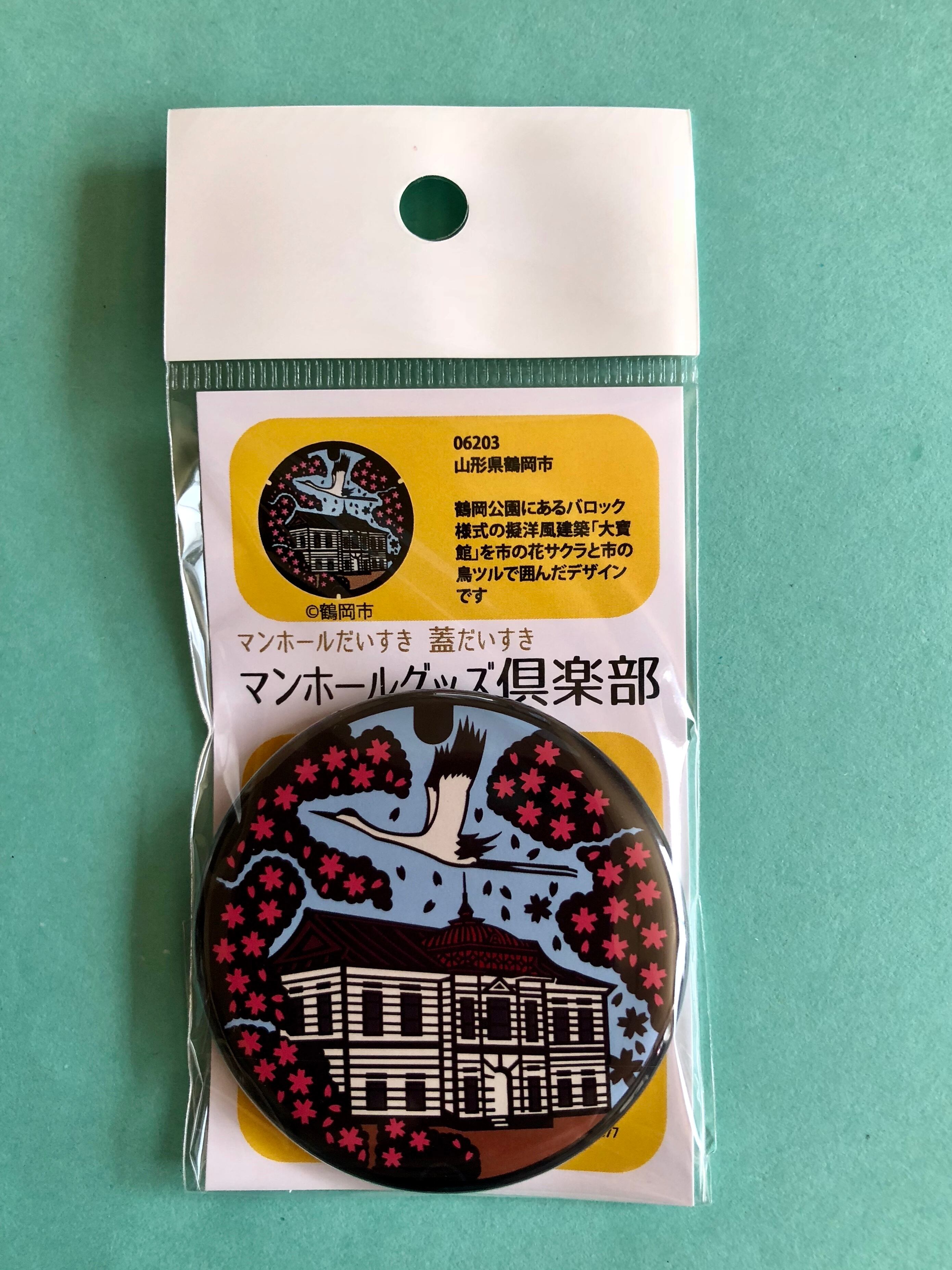 鶴岡公園にある「大寶館」を市の花サクラと市の鳥ツルで囲んだカラーデザイン。