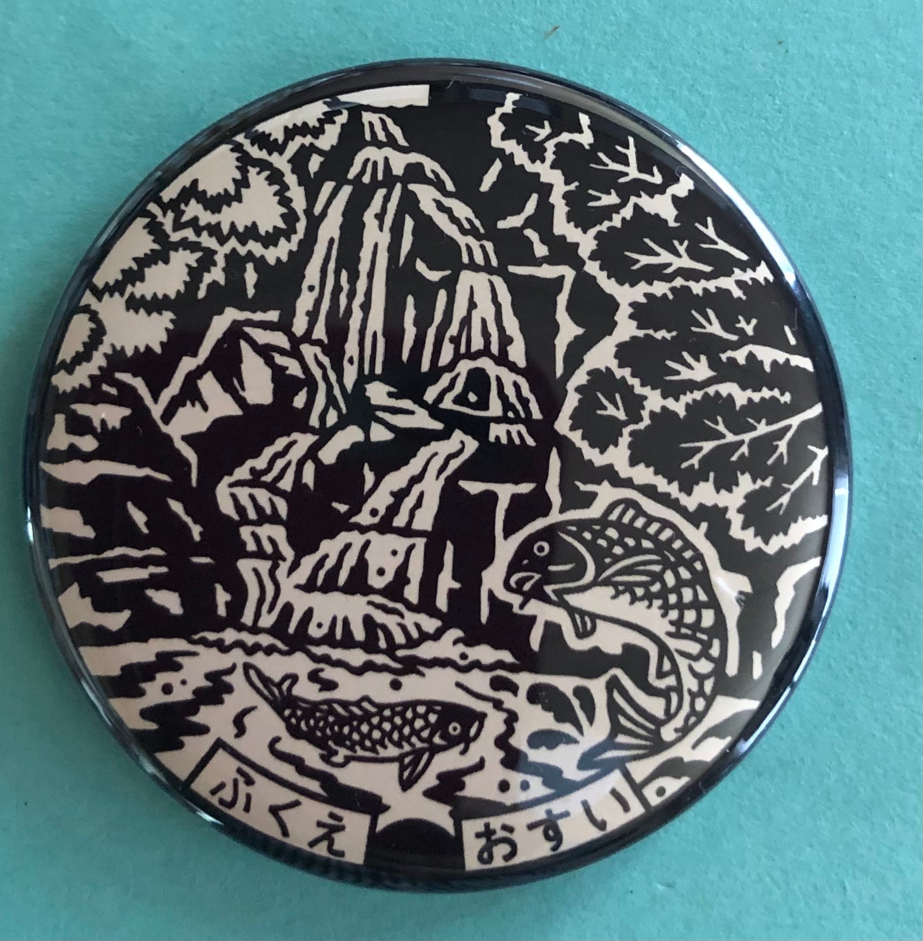 扇子落滝(おうぎおとしのたき)と魚がデザインされています。 その昔、狩りを楽しんで帰城の途中の殿様が滝のそばで一人の美しい娘が横笛を吹いているのを見つけ心を奪われ、思わず持っていた扇を滝壺の中へ落したことから名付けられたという滝。落差が20mあります。
