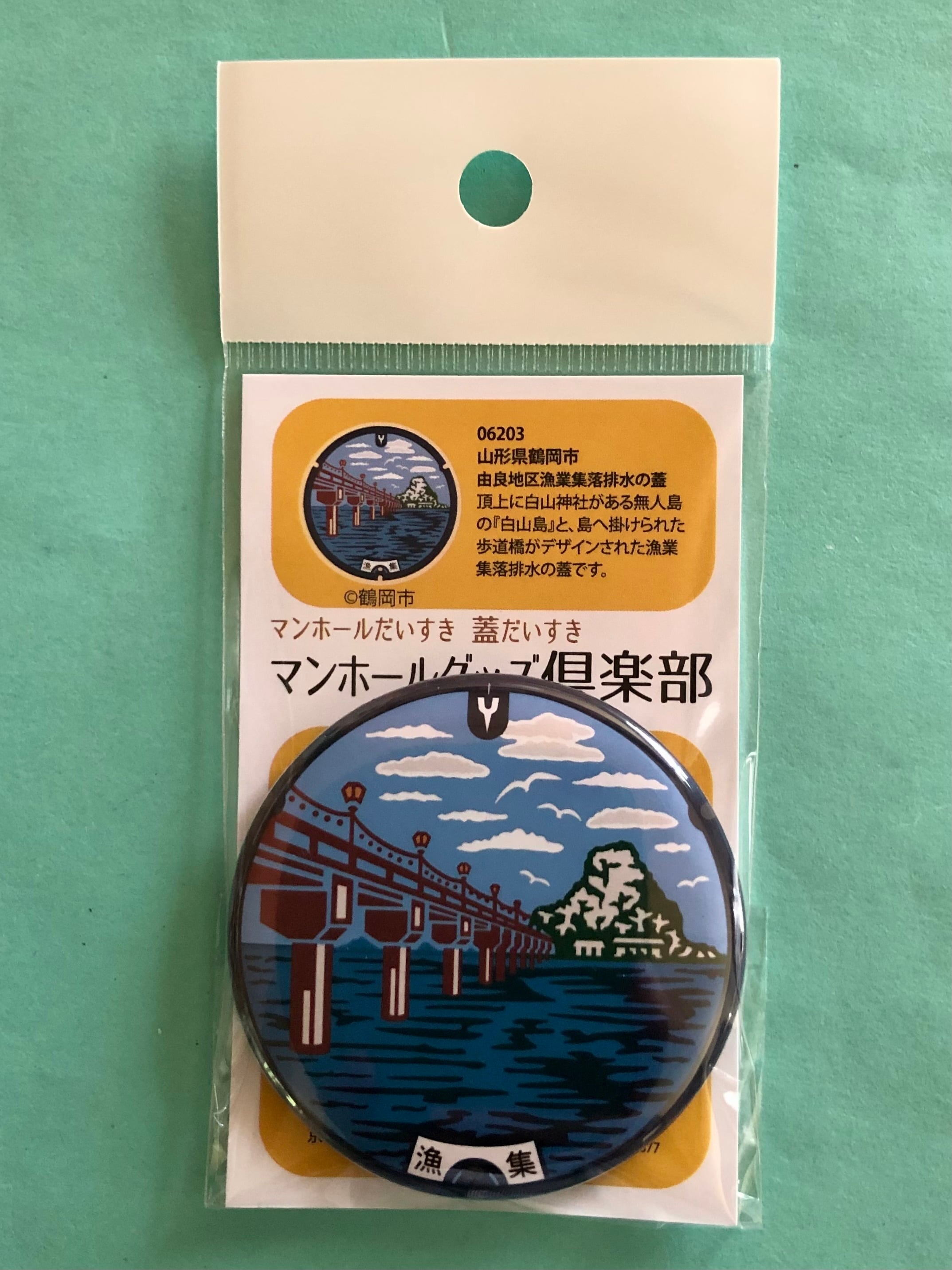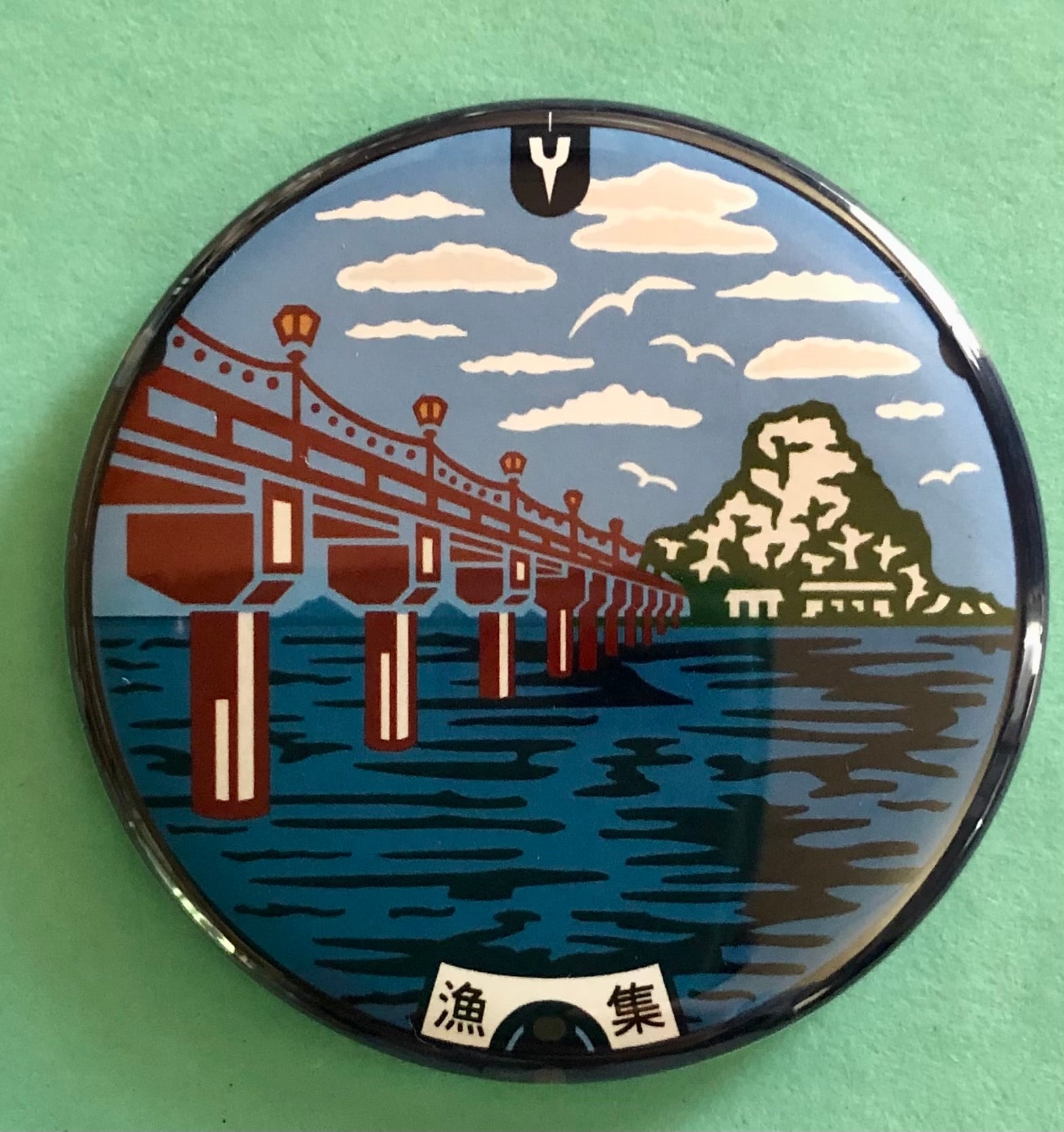 日本の渚100選にも選ばれている『由良海岸』から、100mほど沖合、頂上に白山神社がある無人島の『白山島』と、島へ掛けられた歩道橋がデザインされた漁業集落排水の蓋です。