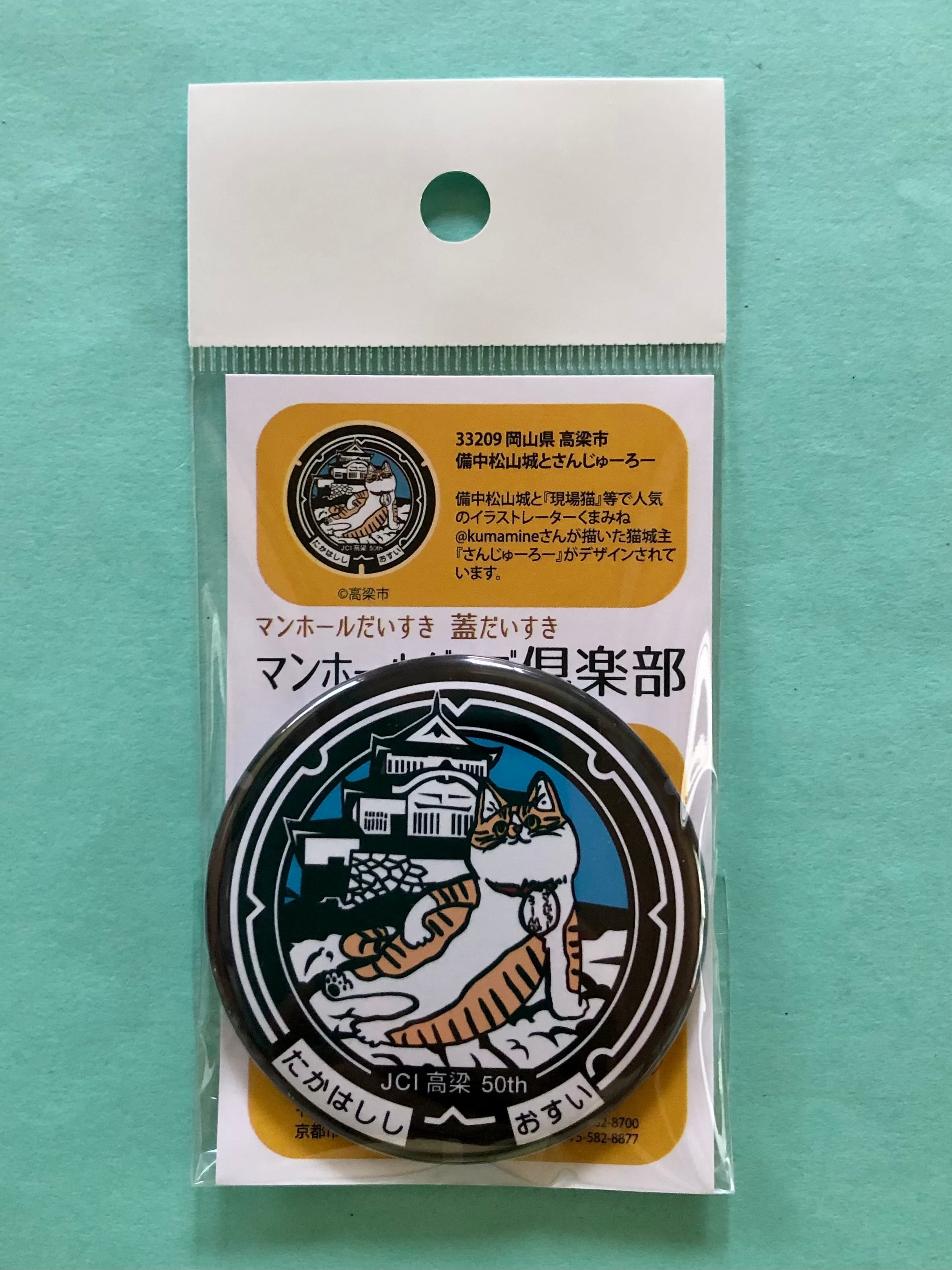 備中松山城と『仕事猫』等で人気のイラストレーターくまみねさんが描いた猫城主さんじゅーろーがデザインされたマンホールの蓋が一般社団法人高梁青年会議所から寄贈されました。