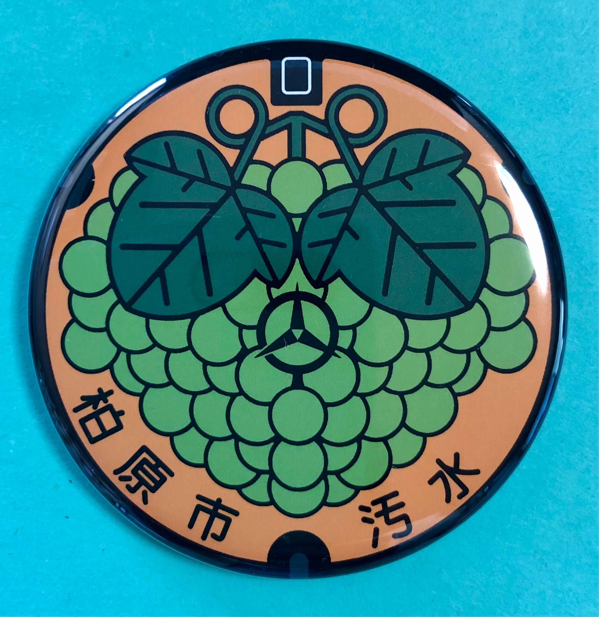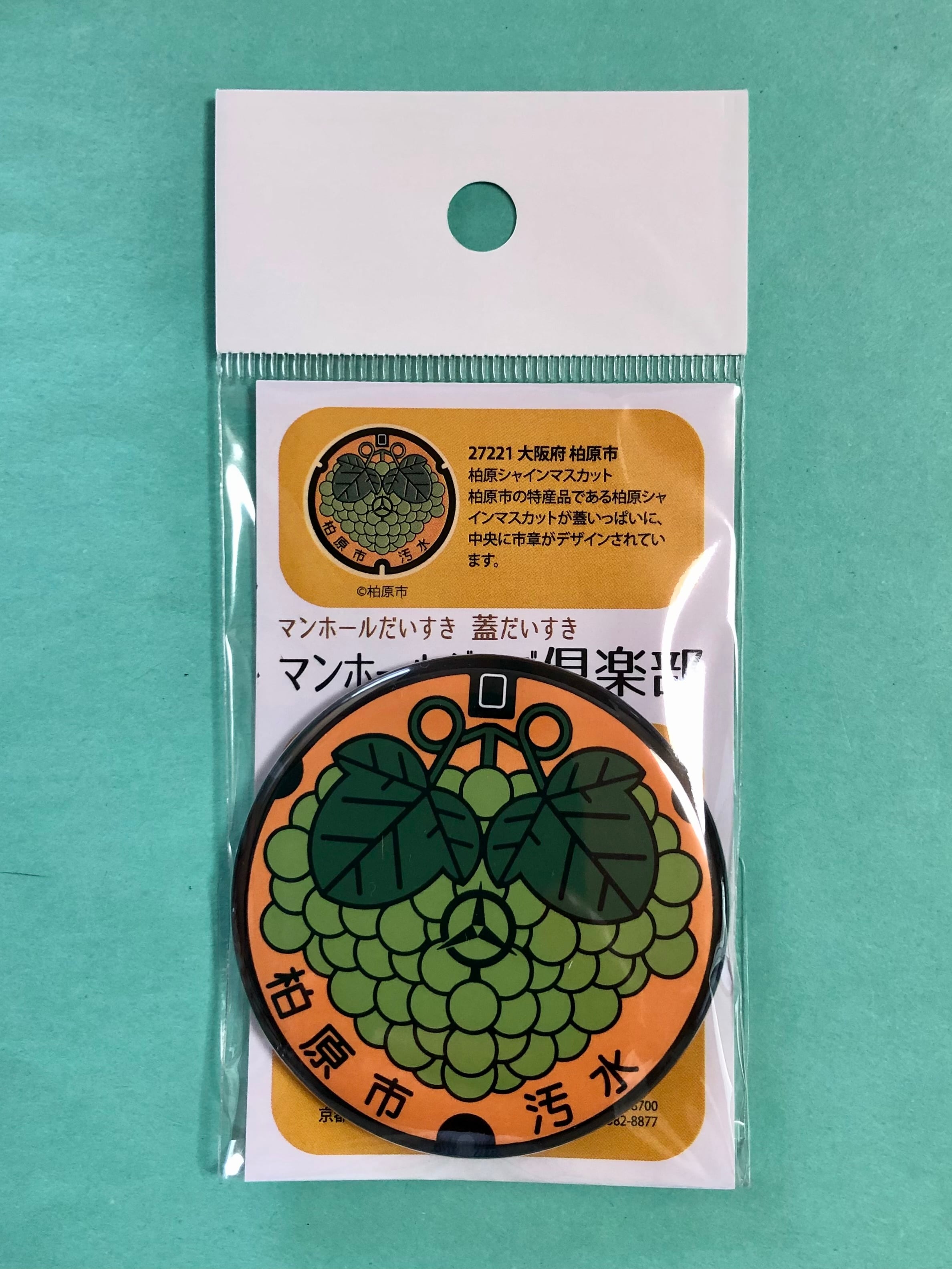 柏原シャインマスカット 柏原市の特産品である柏原シャインマスカットを蓋いっぱいに、中央には大和川と石川の合流点に位置する市の発展と親和を象徴した市章がデザインされています。