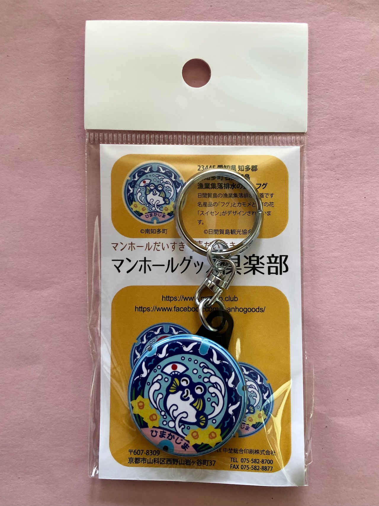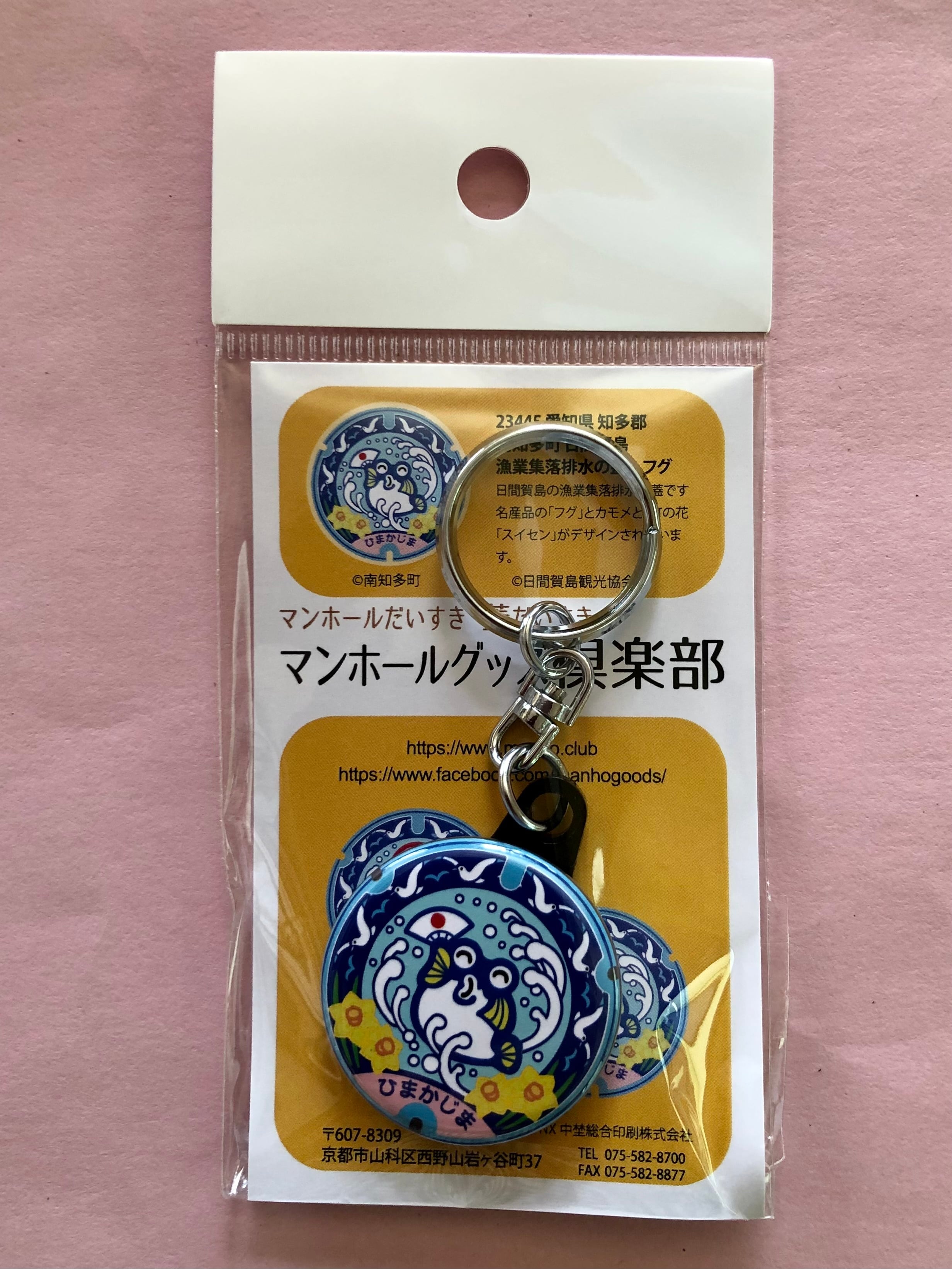 名産品の「フグ」とカモメと、町の花 「スイセン」がデザインされています。日間賀島は、三河湾に浮かぶ離島。