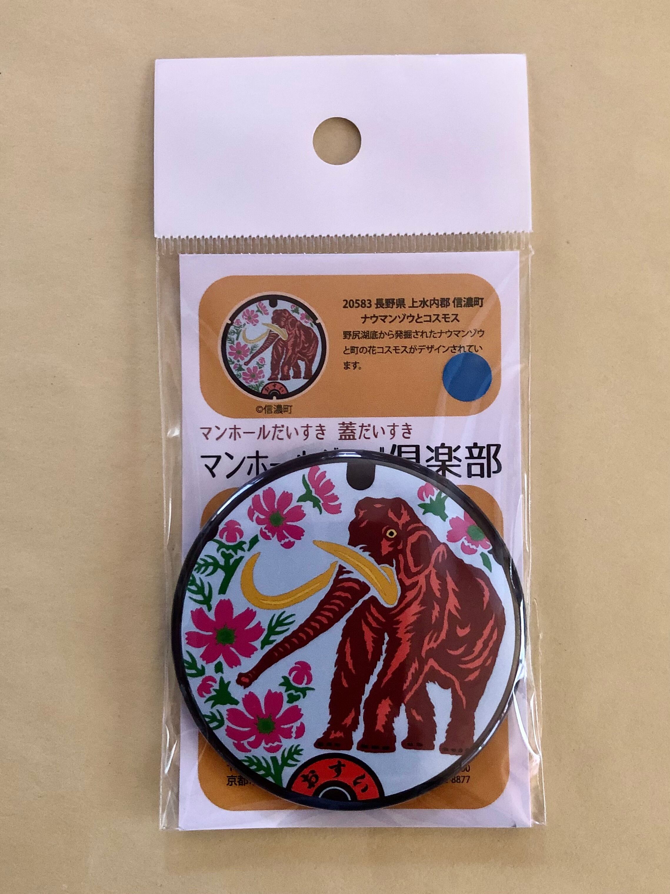 ナウマンゾウと町の花コスモスがデザインされています。 信濃町には長野県の天然湖としては諏訪湖に次いで2番めに大きい野尻湖があります。1948年に野尻湖畔の旅館経営の加藤松之助氏が湖底で氷河時代に生息していたナウマンゾウの臼歯の化石を発見したことをきっかけに化石の発掘が行われるようになりました。野尻湖底からは、ナウマンゾウの歯の化石だけでも約50頭分が発見され日本を代表するナウマンゾウの産地となっています。 出土品は野尻湖ナウマンゾウ博物館に収蔵、展示されています。