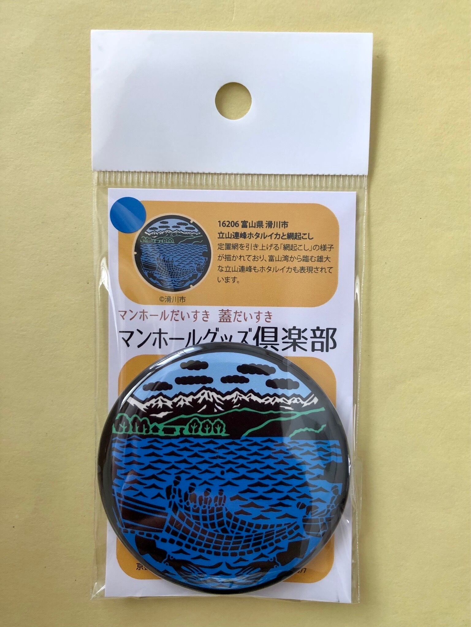 春の訪れとともにやってくる富山湾の神秘「ホタルイカ」 滑川市では、富山県ならではの定置網によるホタルイカ漁が行われており、漁の様子や青白く怪しい光を放つホタルイカの発光を観光船から見学することができます。 マンホール蓋には、漁師たちが定置網を引き上げる「網起こし」の様子が描かれており、富山湾から臨む雄大な立山連峰もホタルイカも表現されています。
