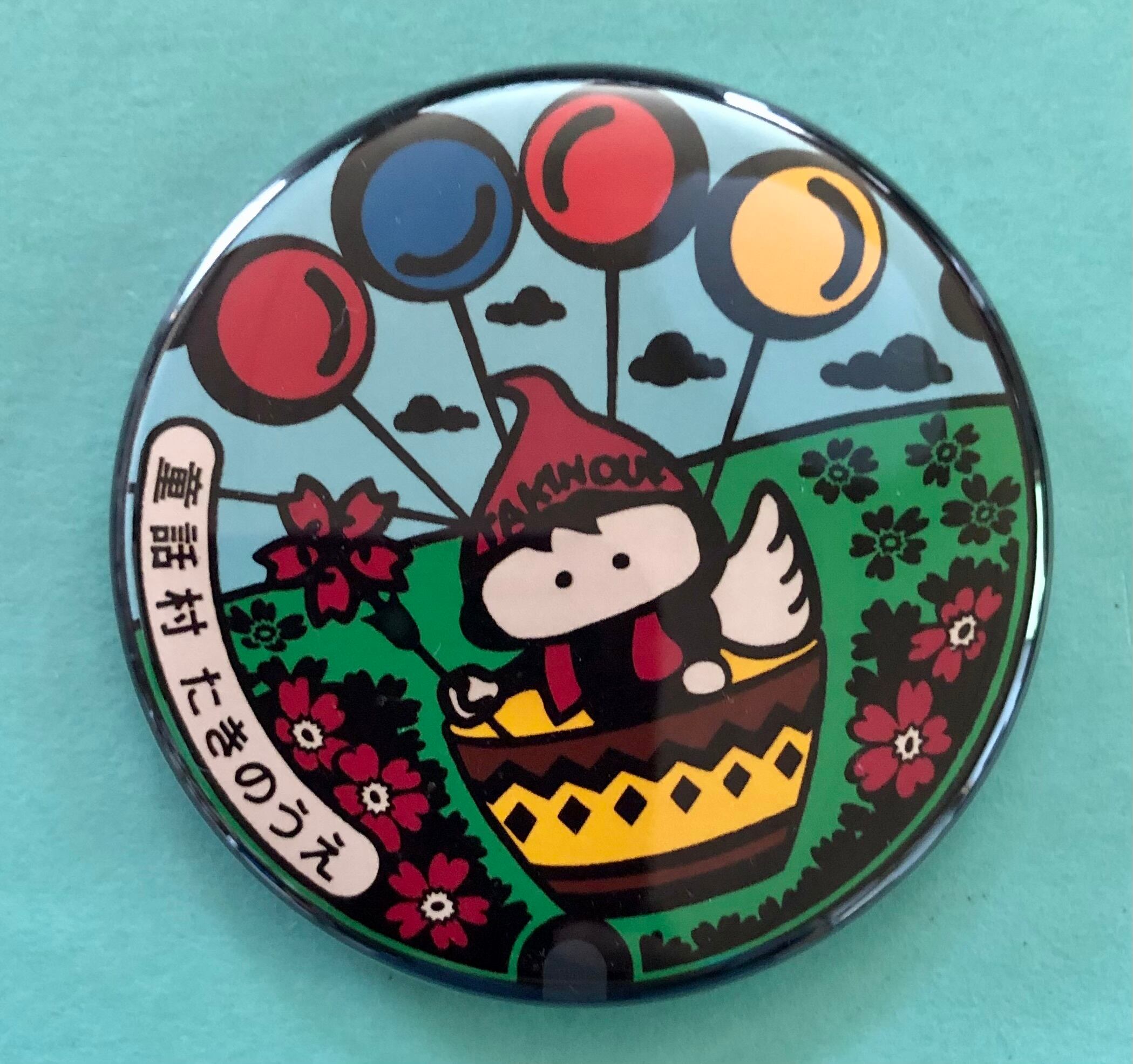 「童話村たきのうえ」というキャッチフレーズ 気球に乗った「ピコロ」周囲には町の花シバザクラがデザインされています。